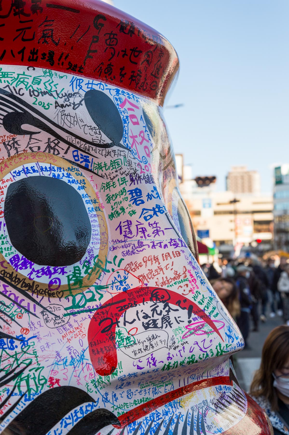 Diese leuchtend roten Glücksbringer aus Pappmaché verkörpern Durchhaltevermögen, Entschlossenheit und die Fähigkeit, Herausforderungen zu meistern. Zu Beginn sind die Daruma-Puppen augenlos. Beim Kauf malt man eines der Augen aus, während man sich etwas wünscht. Sobald sich der Wunsch erfüllt hat, wird das zweite Auge ergänzt. Das Fest selbst beginnt normalerweise mit rituellen Verbrennung der Daruma des vergangenen Jahres, um Dank auszudrücken und Platz für neue Wünsche zu schaffen.