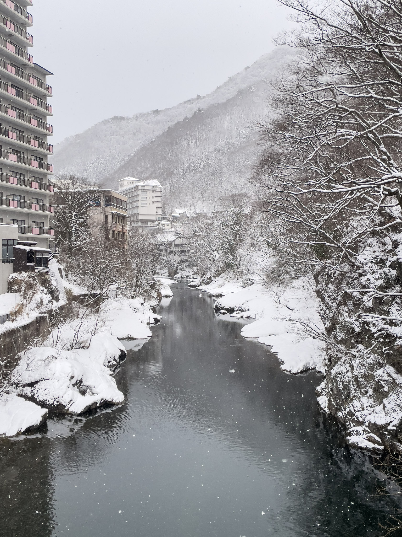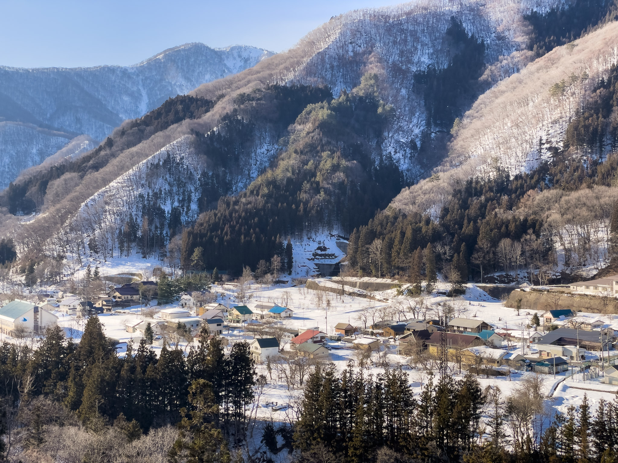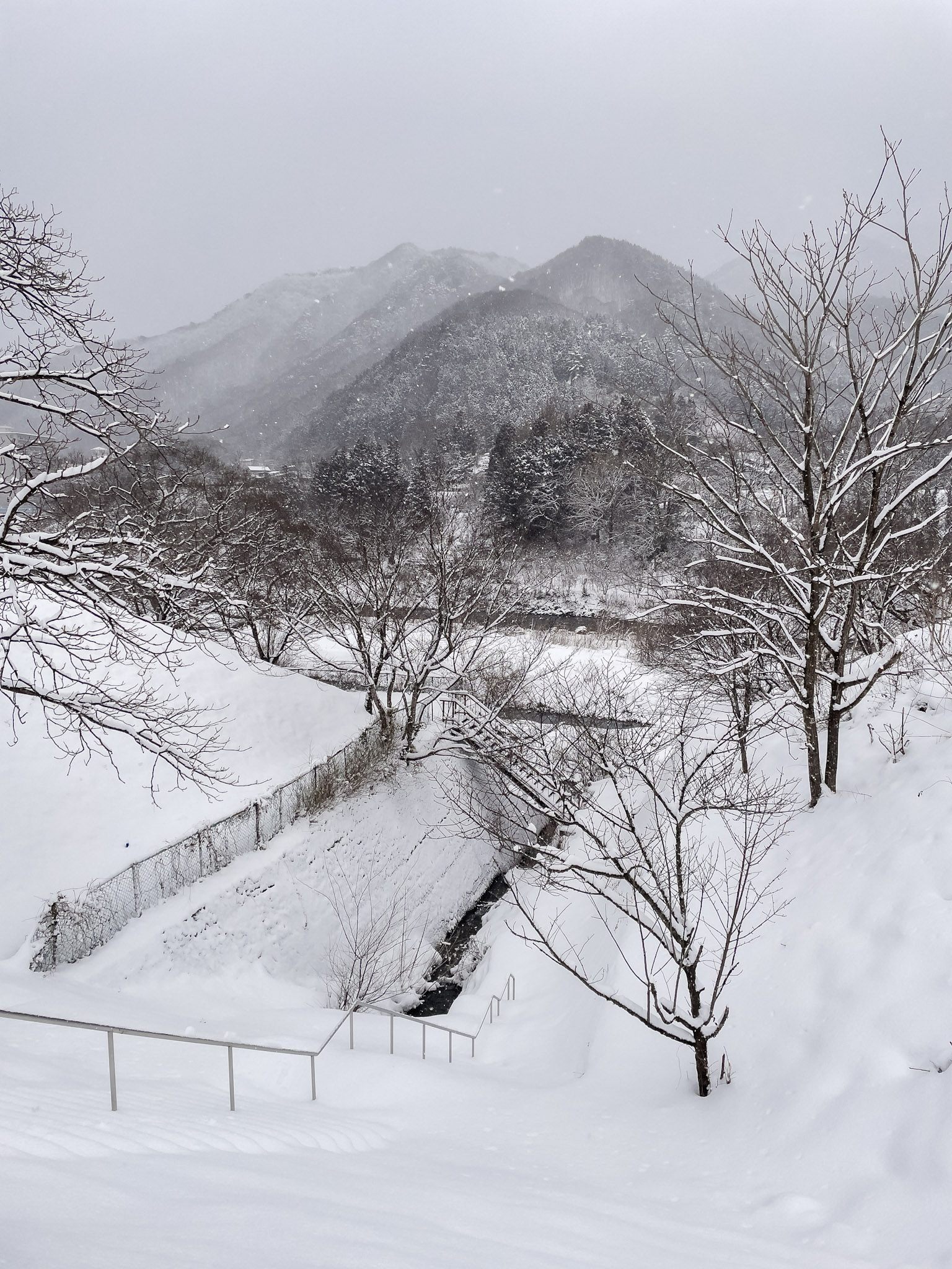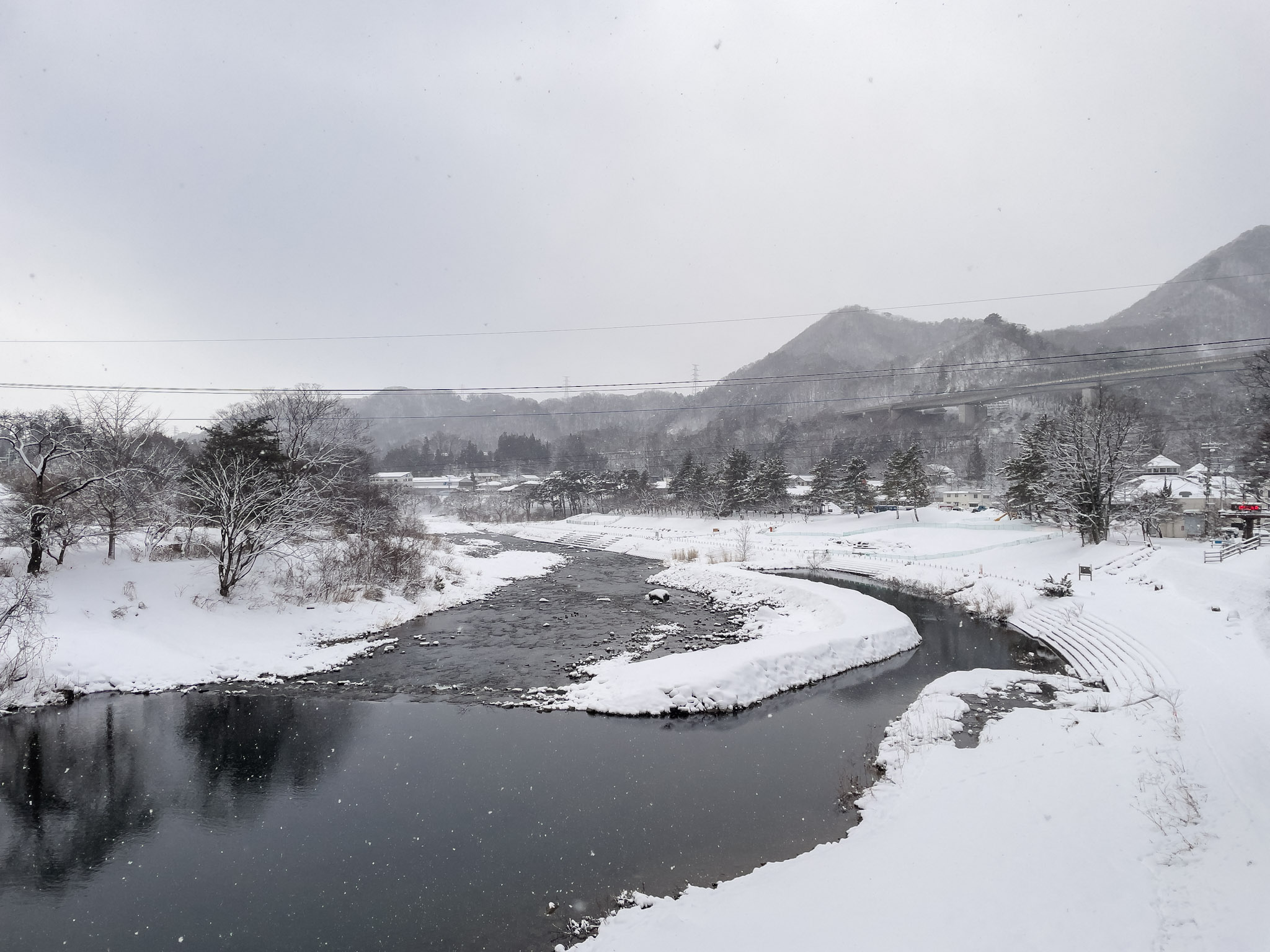 Looks nice, right? Especially on the small streets where the snow is still on the ground, and with the low clouds, it creates a nice atmosphere. Since the main streets are flooded through pipes with water from the river, you need to be careful not to get splashed by cars. In Japan, sidewalks are quite rare, especially in the countryside.