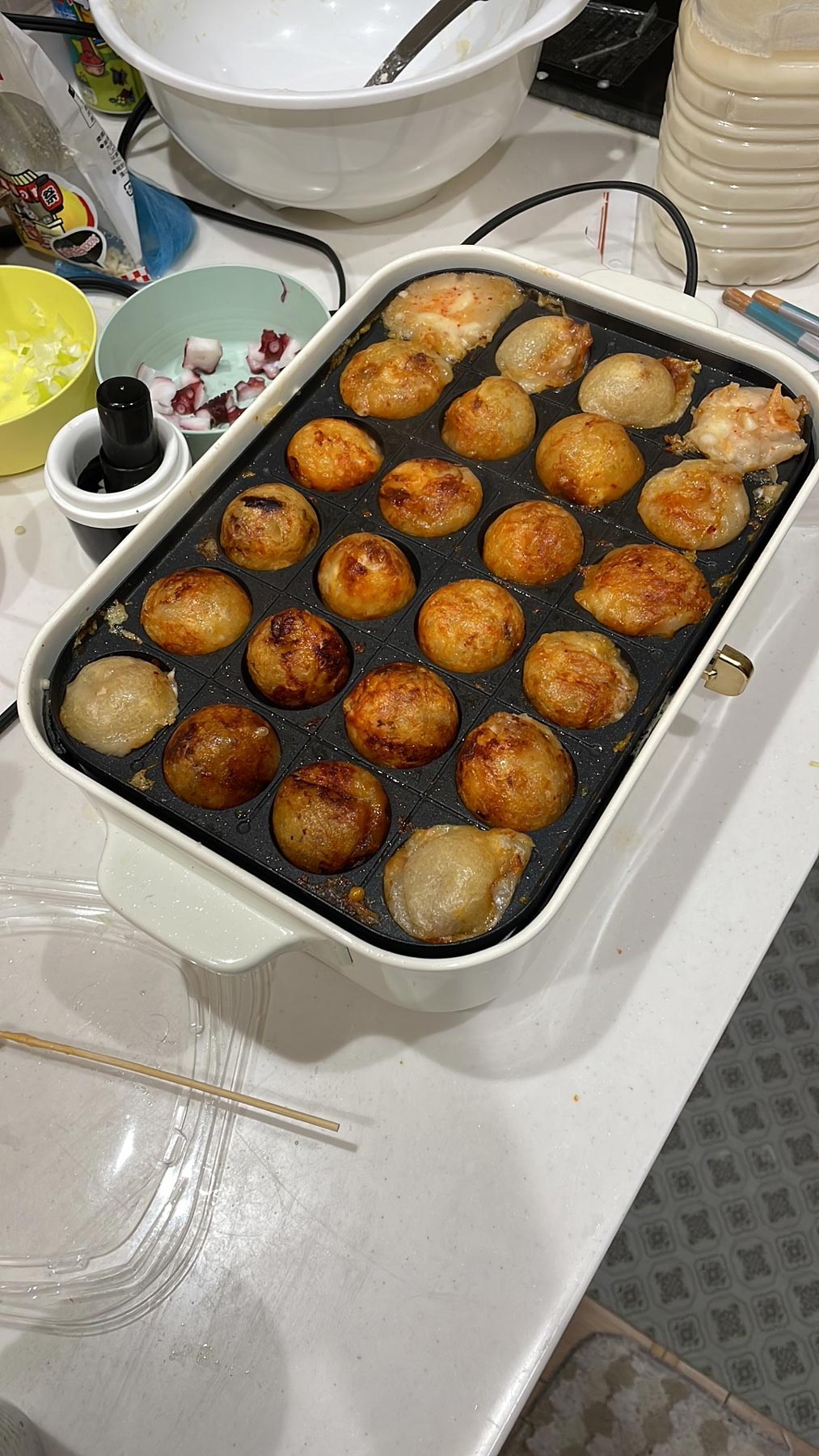 We dipped kimchi, cabbage and/or cheese into it. Together with mayo and a Japanese sauce it tasted great, with four rounds in total we had just about 100 balls.