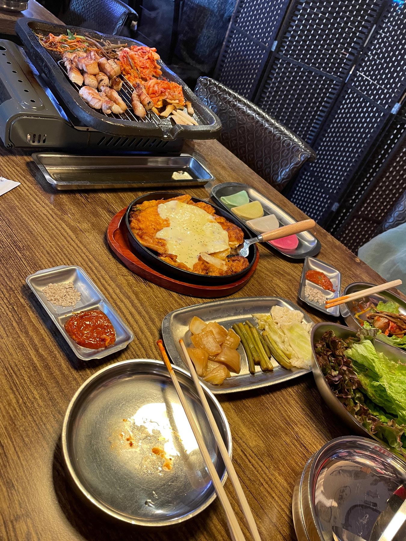 Zuletzt in Kanada oder vor langen mal selbst gemacht zuhause haben wir koreanisch in Tokyo gegessen. Mit einem kleineren Gasgrill hatten wir Bauchfleisch, Kimchi, Pilze, eine Art Kimchipfankuchen mit Kaeseuberbacken, Eisnudeln, sowie Salat, bunten Rettich, Zwiebel und kleine Dips.