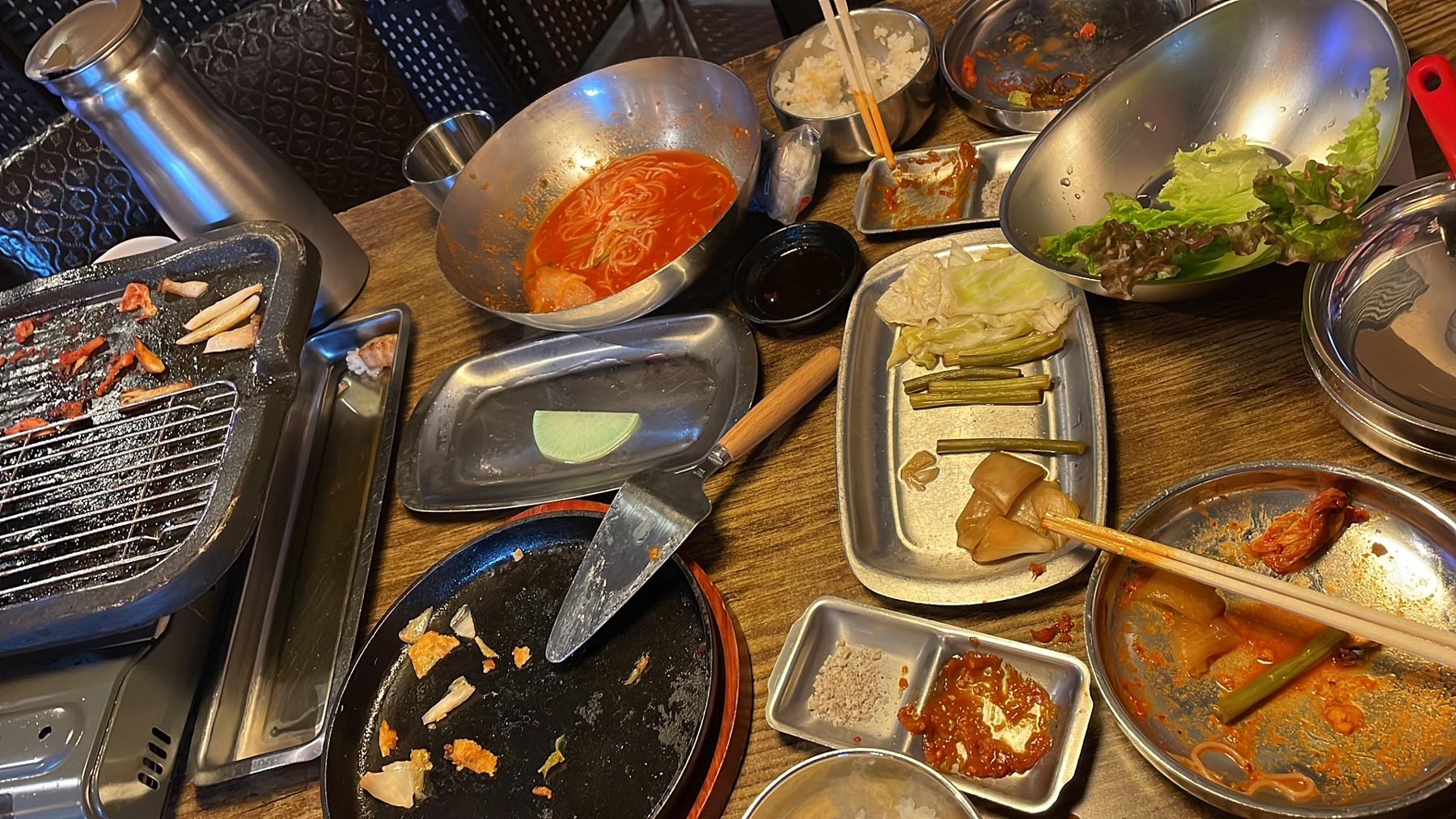 Last time in a restaurant in Canada or sometimes homemade we ate today Korean food in Tokyo. With a table bbq we had yummy belly meat, kimchi, mushrooms, a kind of kimchi pancake with overbeaked cheese, ice noodles, salad leafs, colorful radish, onions and small dips.