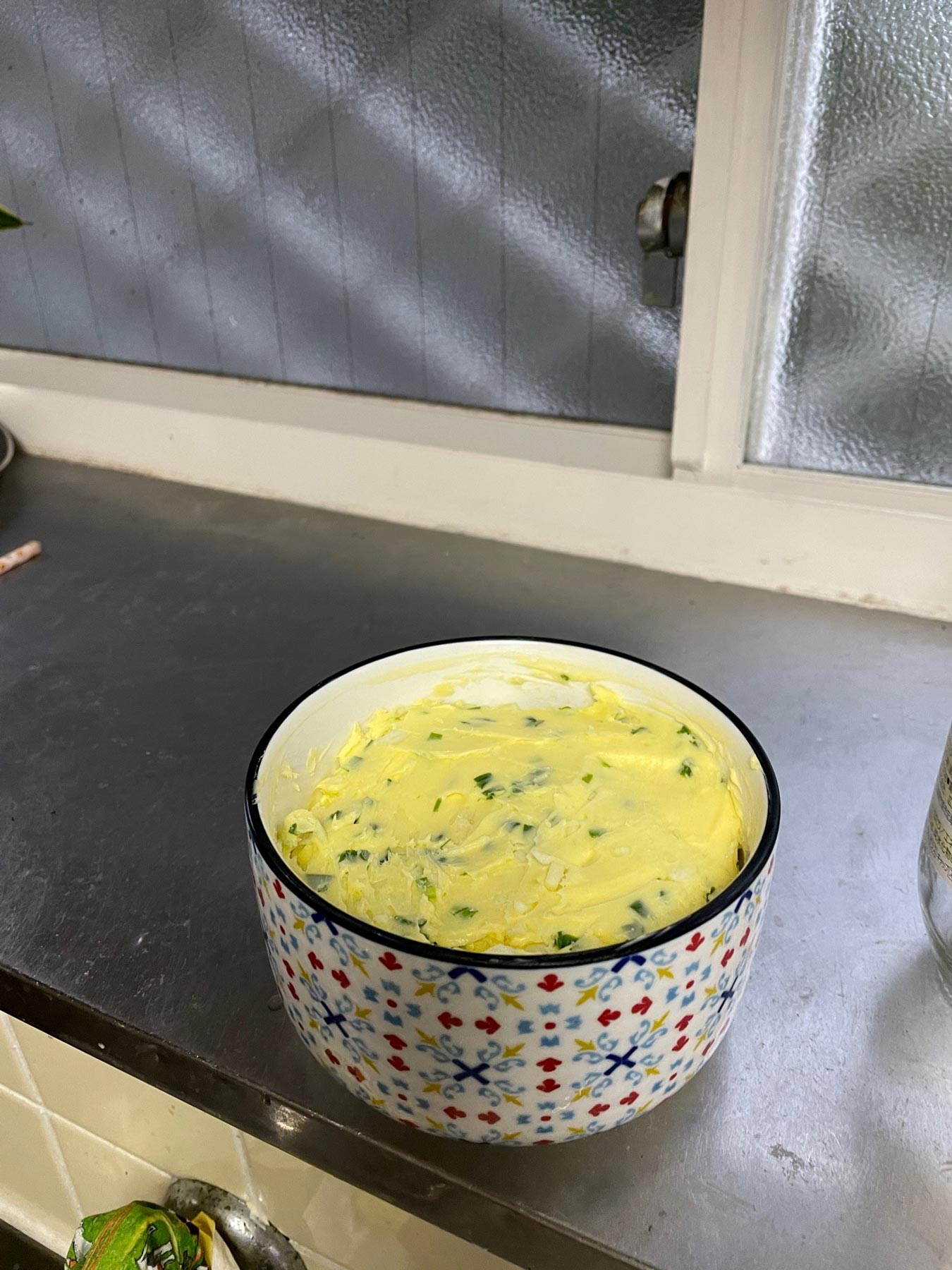 Als Vorbereitungen fuer unser treffen mit Freunden habe ich heute Kraueter-/Knoblauchbutter und gebratenne Mandeln gemacht. Insgesamt 750 gramm Butter und 1 kg Almonds :D Viel zu viel, aber beides kam bei allen hier bisher super an. Bin gespannt ob es allen auch morgen schmecken wird.