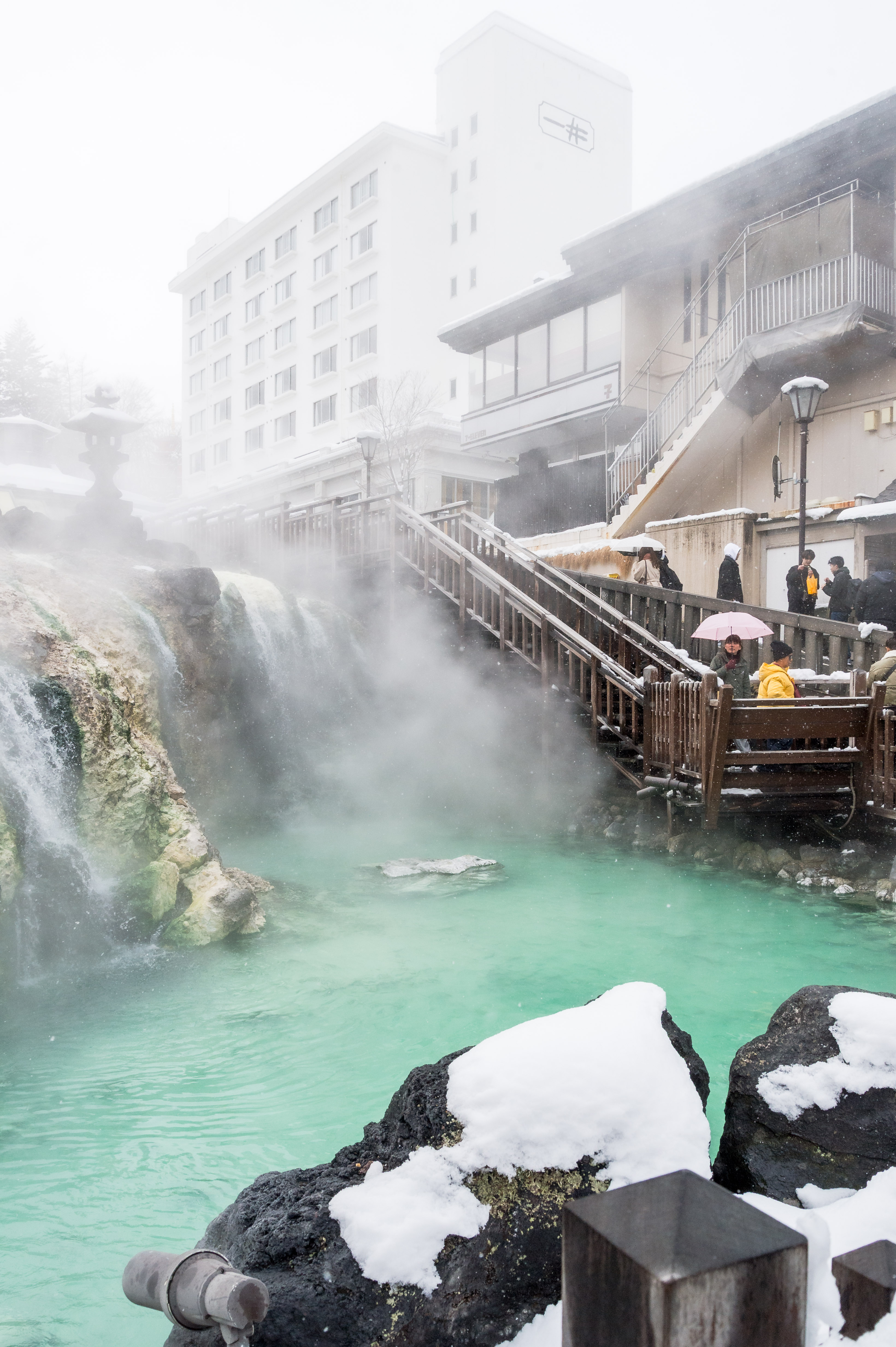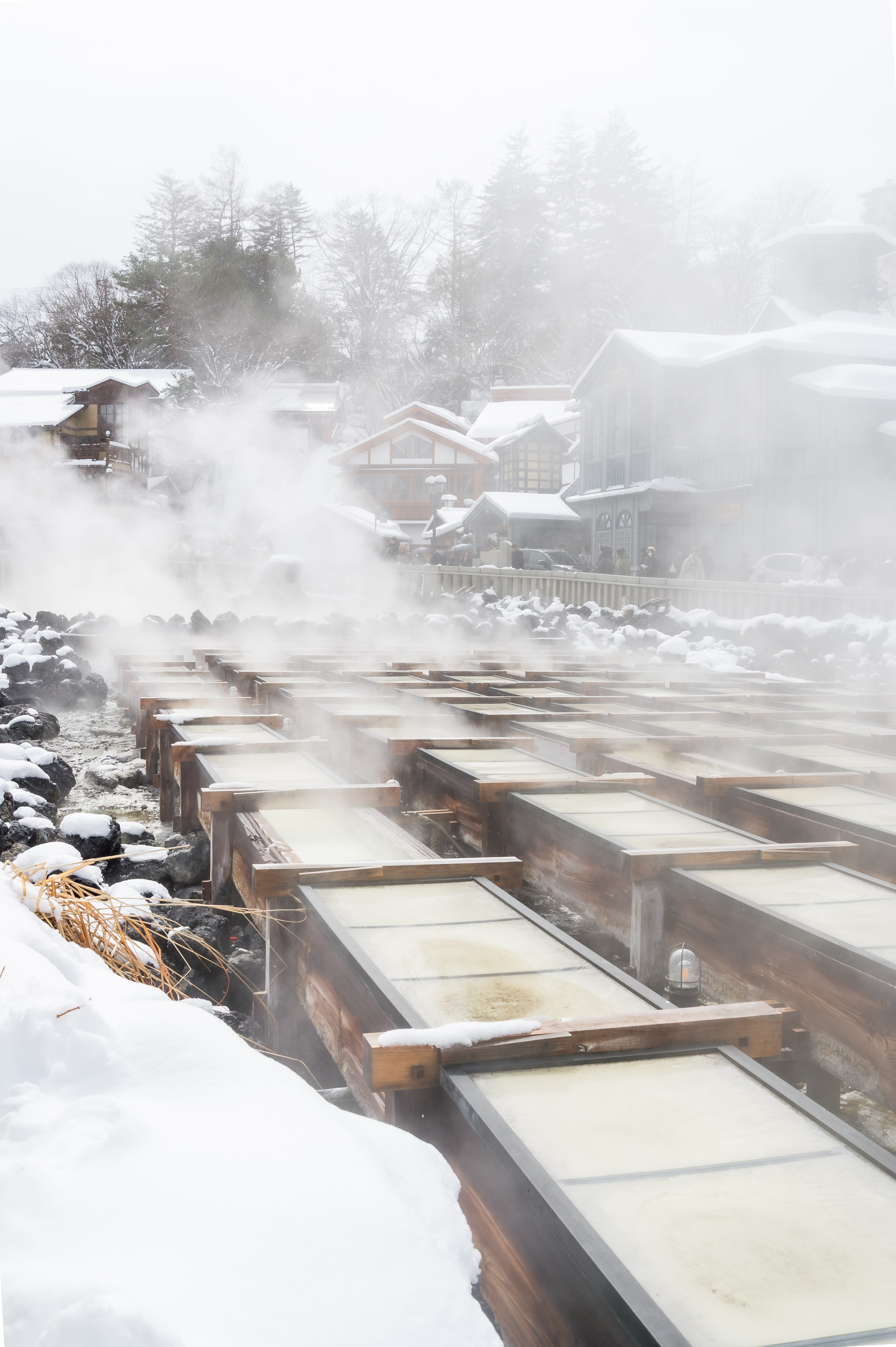 Kusatsu ist bekannt für seine Onsen und Ryokans, eingebettet in die Berge der Präfektur Gunma. Berühmt für sein stark säurehaltiges, schwefelhaltiges Wasser, ist Kusatsu Onsen seit Jahrhunderten ein renommiertes Thermalbad, dem heilende und gesundheitsfördernde Wirkungen nachgesagt werden. Am bekanntesten ist das Yubatake, ein großes heißes Wasserfeld, in dem das dampfende Onsenwasser durch hölzerne Kanäle fließt, um abzukühlen, bevor es in verschiedene Bäder geleitet wird.