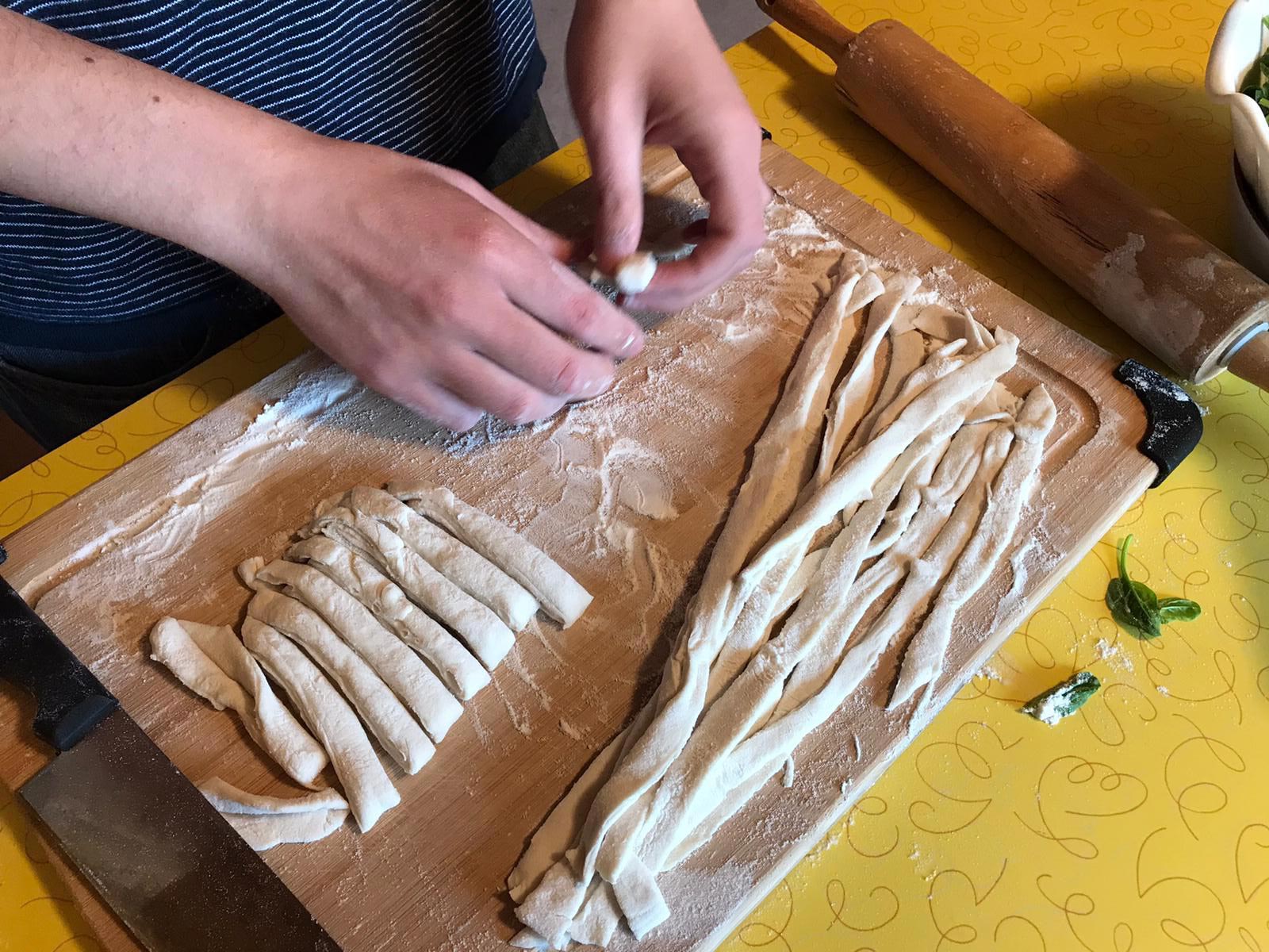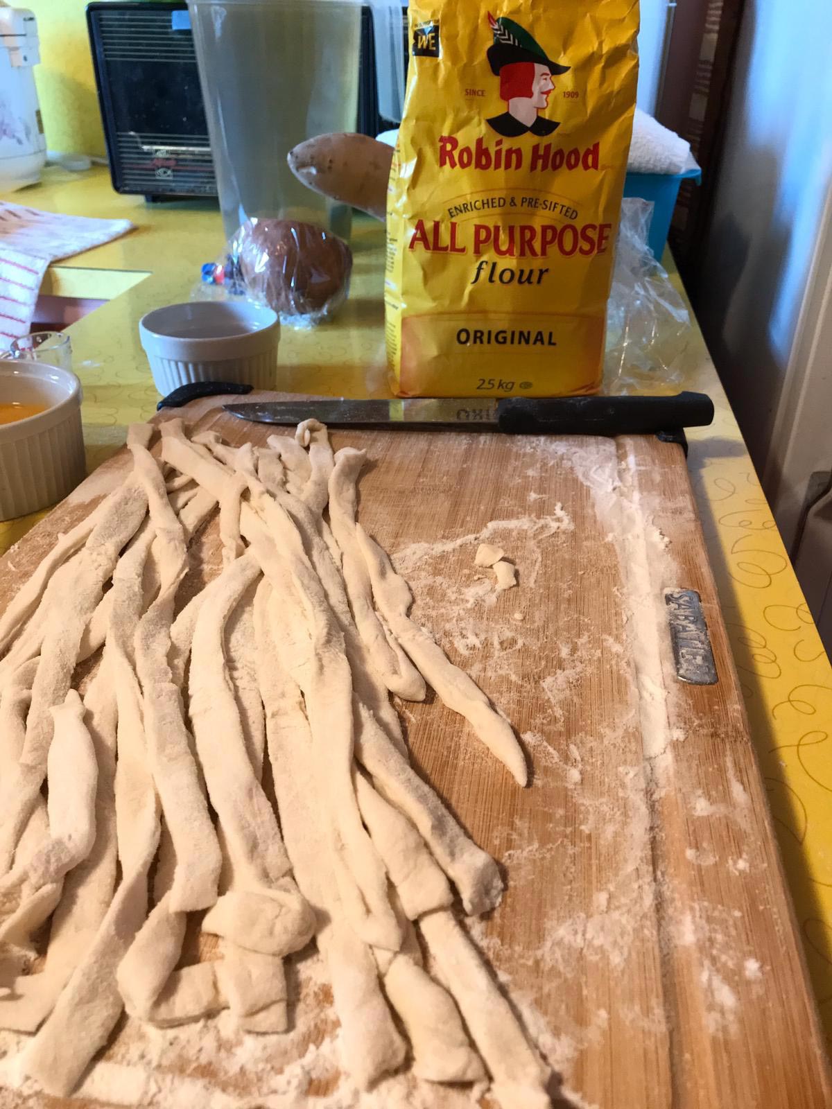 Als Teil unseres japanischem Gerichts, entschieden wir uns Udon Nudeln selbst zu machen. Udon werden hergestellt aus Weizenmehl, Speisesalz und Wasser. Die Nudeln besitzen eine weiße bis cremeweiße Farbe, und eine weiche und elastische Konsistenz. Dazu gab es eine Zwiebelbrühe mit Hähnchen, Spinat und Ei. Als Beilage ein Mix aus trockenen Fisch, dem restlichen Spinat und Dressing.