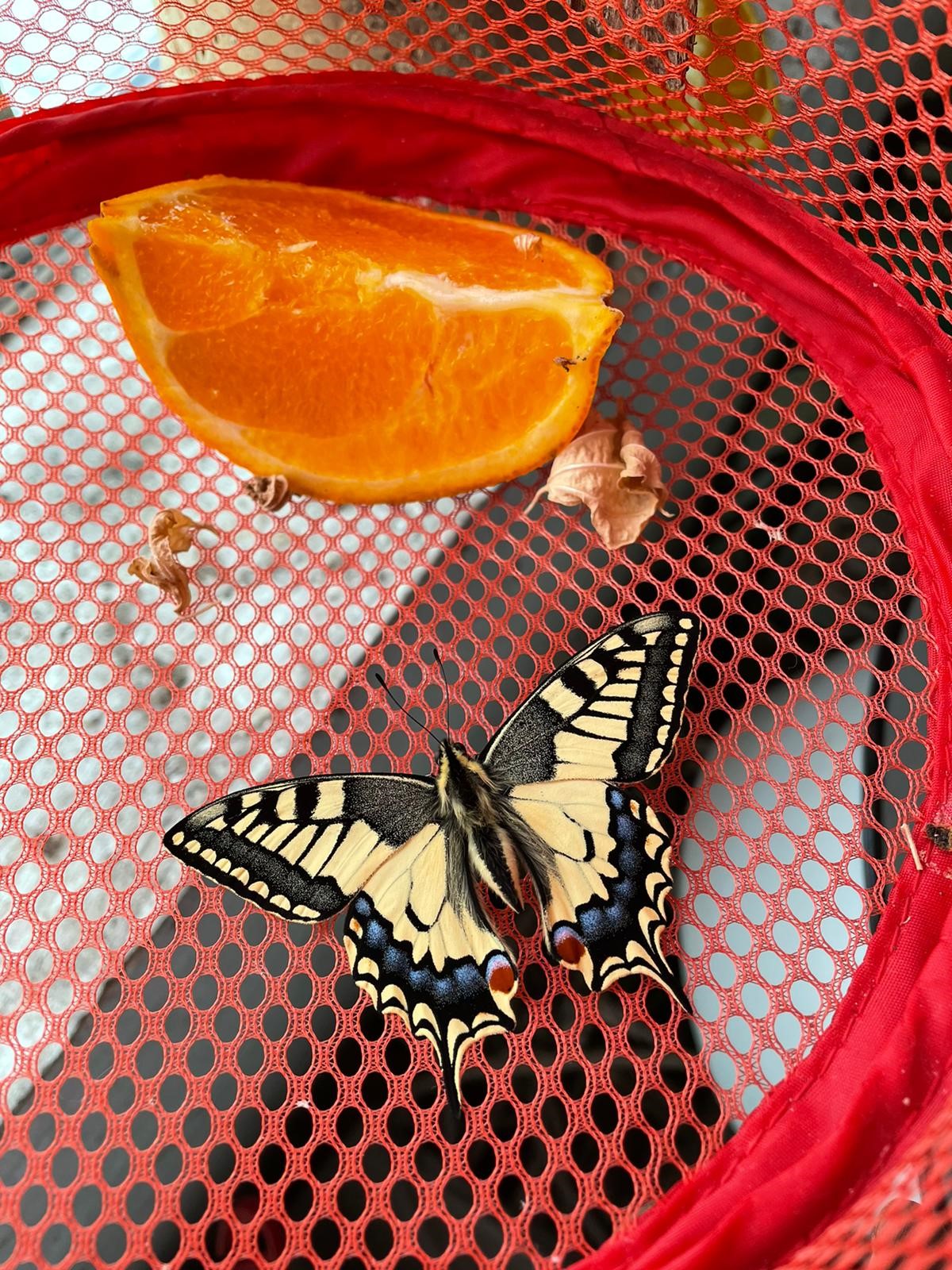 Ich war etwas ueberrascht als der Schmetterling aus dem Haenger direkt auf meine Brust flog und dort ein wenig verharrte, anscheinend war er erst vor kurzem entpuppt.