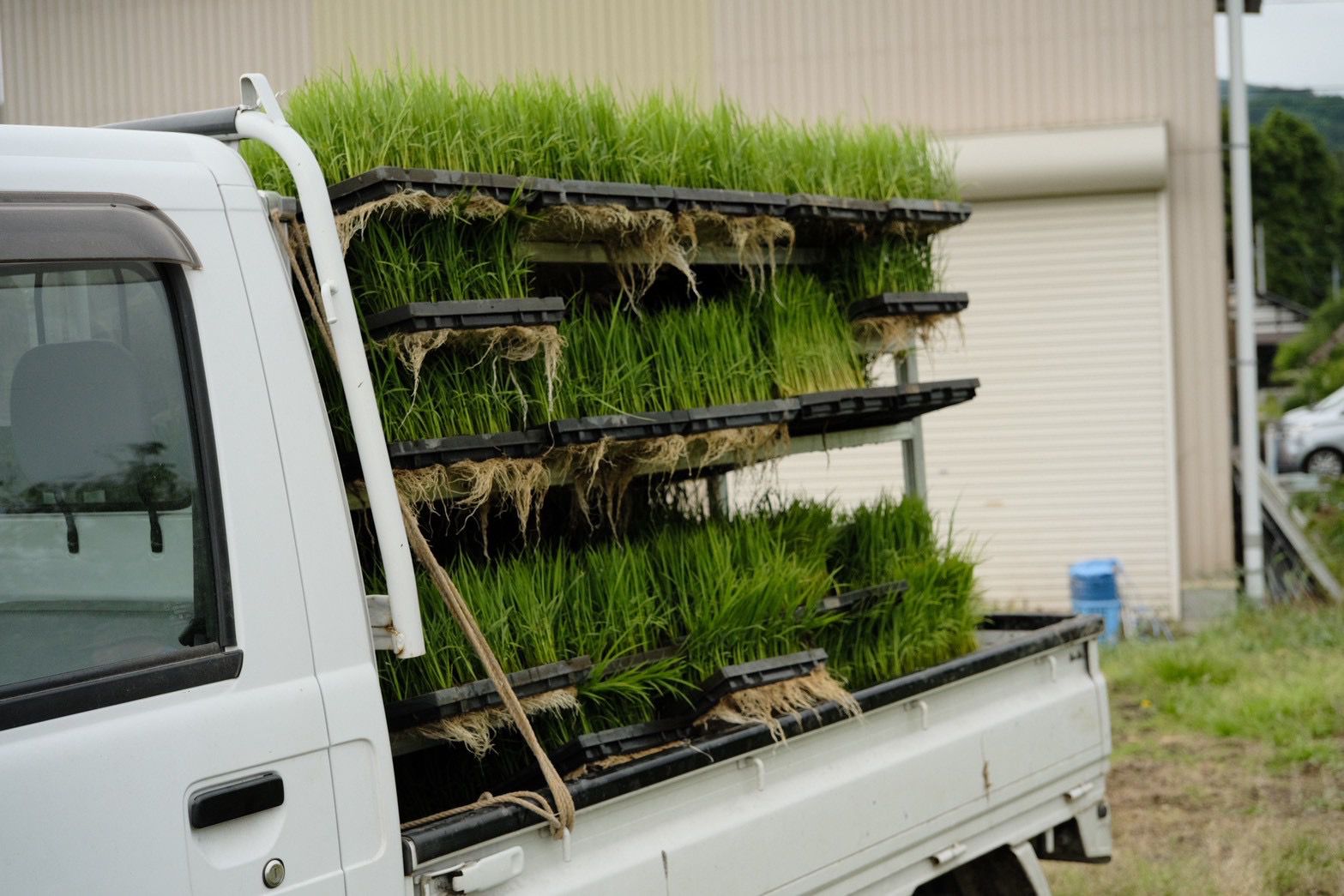But before heading into the field, there was some preparation to do. The rice seedlings, stored in a water basin, had to be sorted. Any yellowed or damaged plants, roots included, were removed. After that, we separated the roots so the bundles could be taken out of the trays more easily — and then fed directly into the holder of a small loading machine.