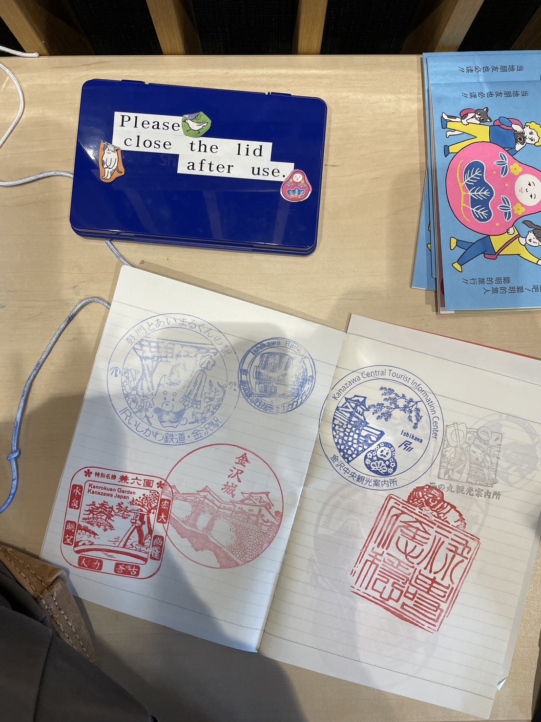 So far, I’ve collected five more stamps from Kanazawa. The first two are from the station, followed by ones from Kanazawa Castle, the famous Japanese garden Kenrokuen, and the tourist information center.