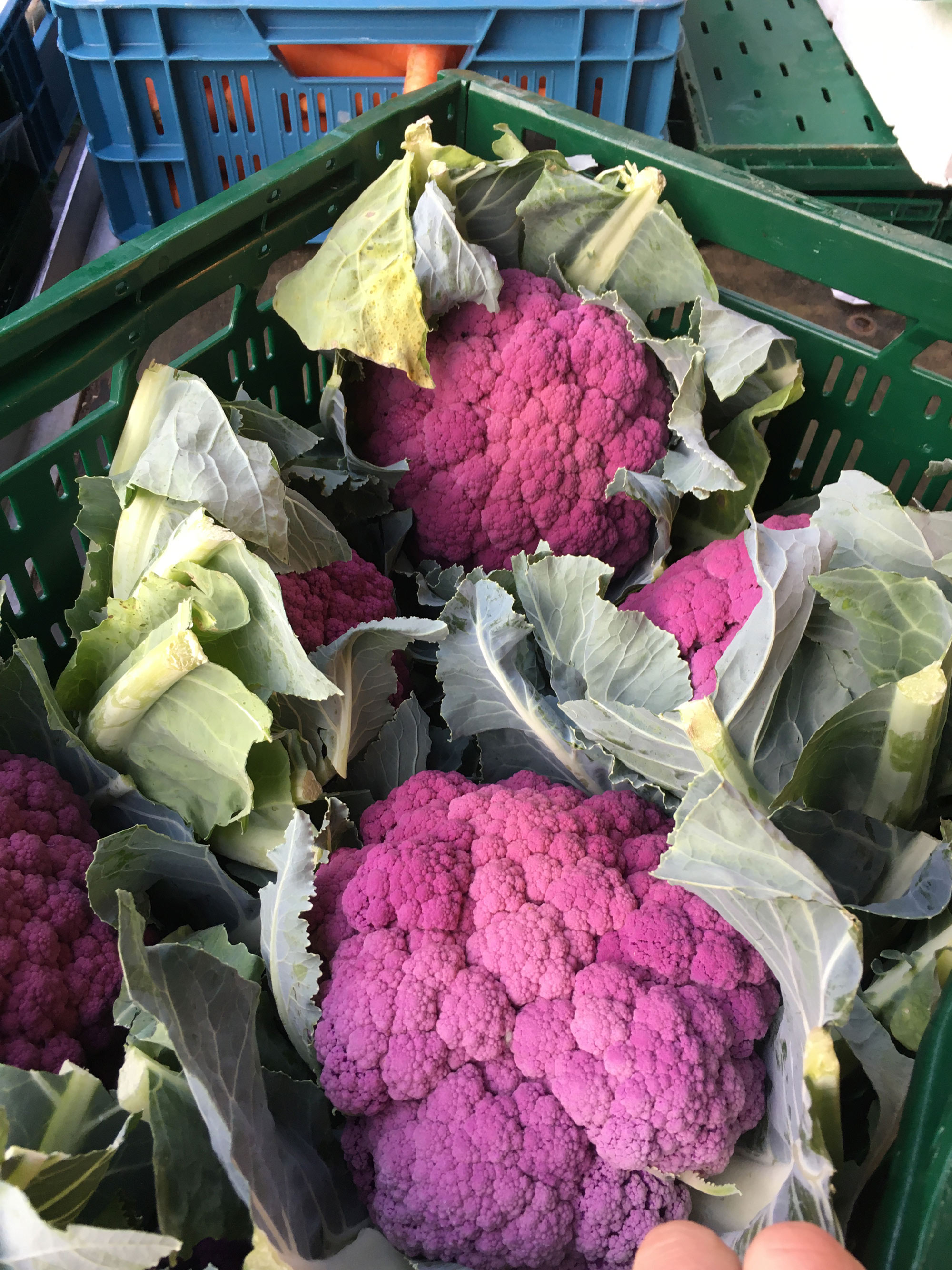 Sometimes we have a small eyecatcher like colourful radishes, purple carrots or this time a purple cauliflower. The customers getting curious asking questions and most times they want to try it out.
