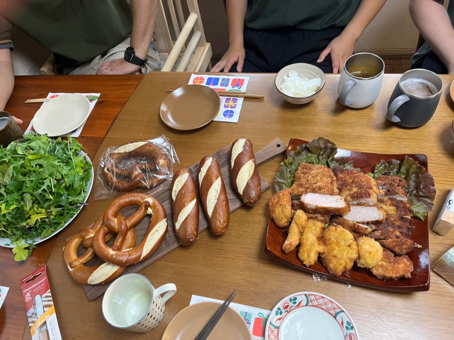 With Japanese schnitzel, pretzels, rice, cheese, salad, beer and sake we could fill our bellies.