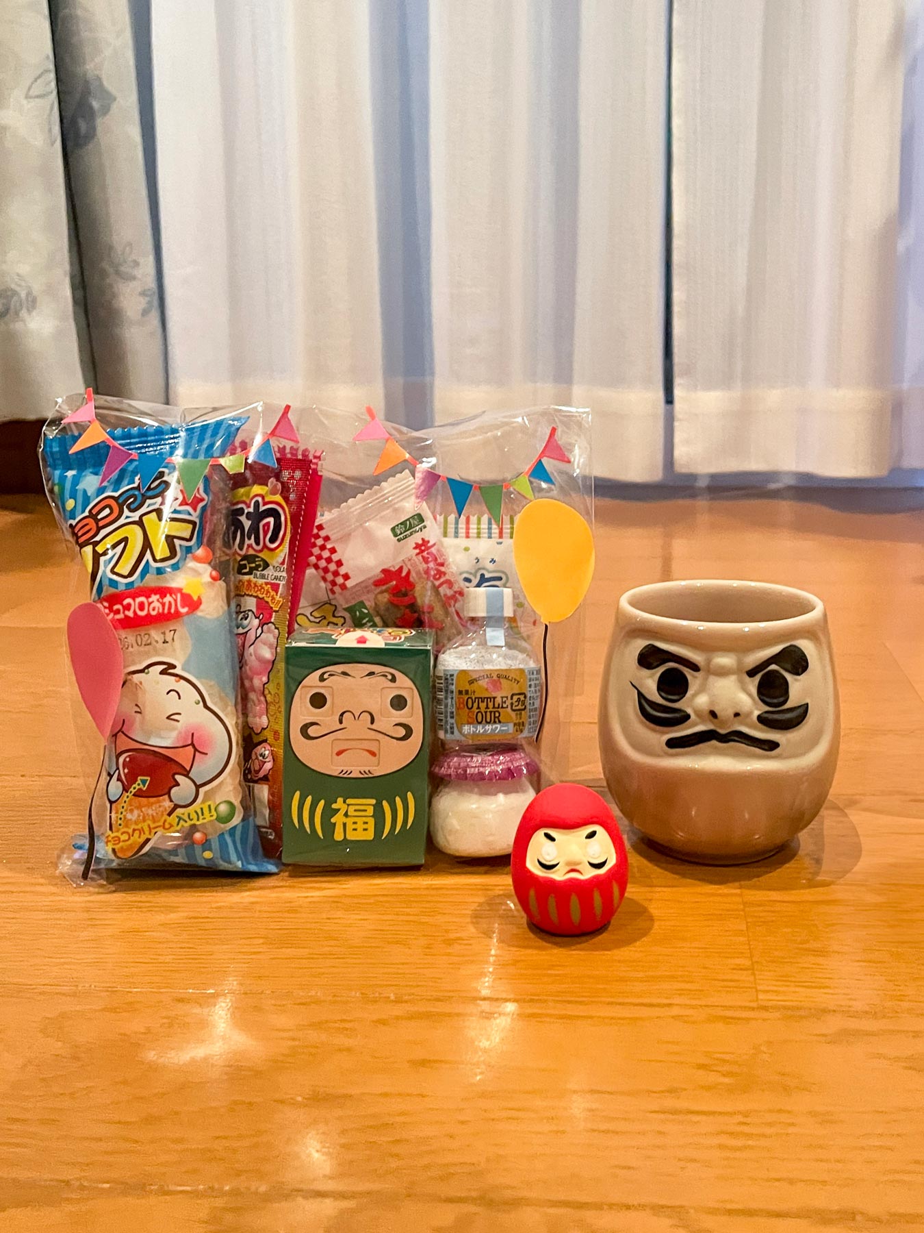 Ich habe ein paar japanische Kleinigkeiten zum Geburtstag bekommen – darunter klassische japanische Naschereien und Darumas, zum Beispiel als Tasse. :) Außerdem ein Bierset, das ebenfalls, zumindest in meinen Augen, ganz typisch japanisch aufgemacht ist.