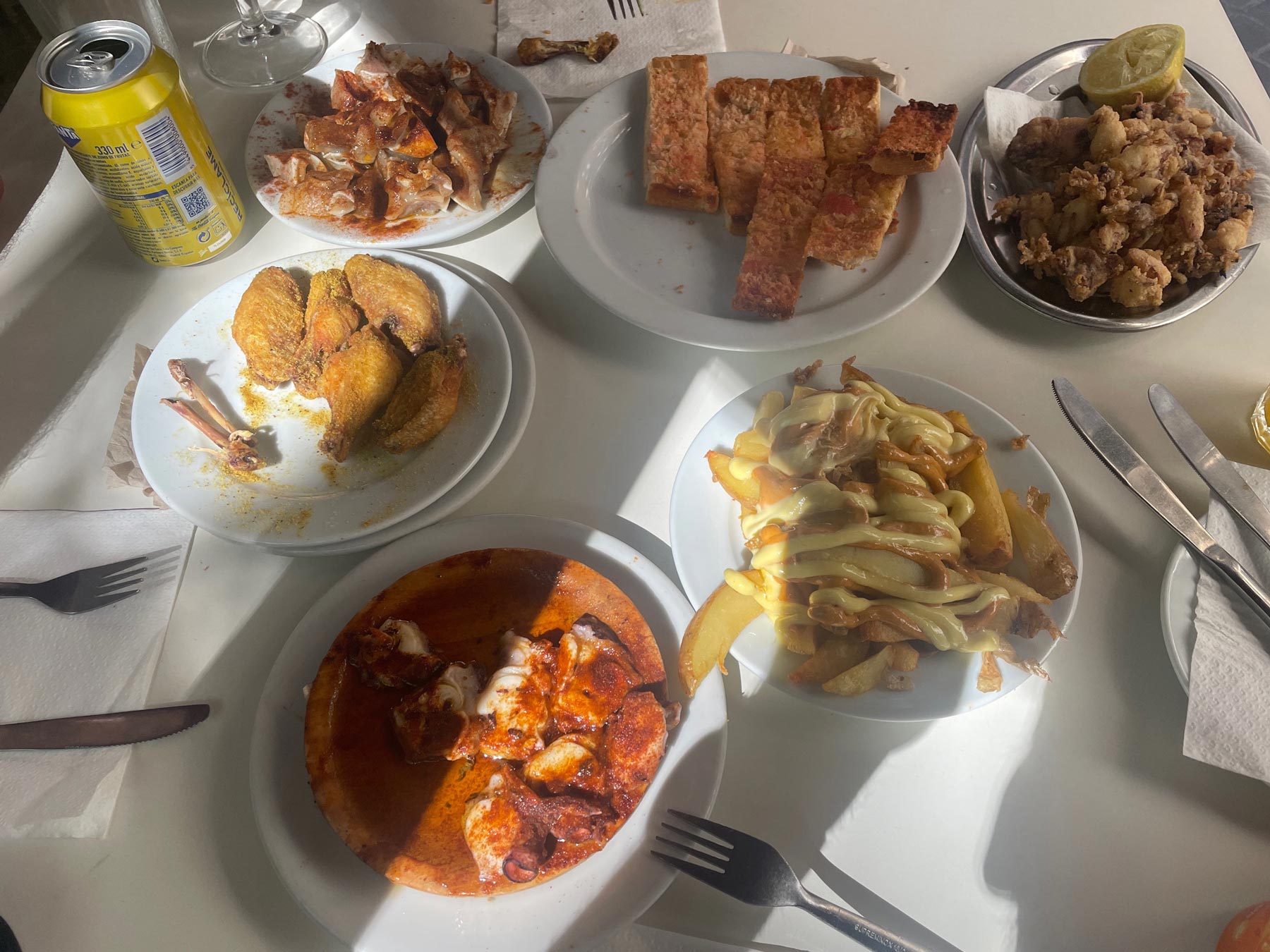 Einmal quer durch die Stadt und es ging zu einem kleinen Lokal mit Tapas, dort teilten wir uns typisch katalanisches Brot mit Tomate, Bratkartoffeln, Chickenwings, Tintenfisch und Schweineohren :P. Das ist nicht das, was ich normalerweise esse, aber der andere Geschmack war gut!