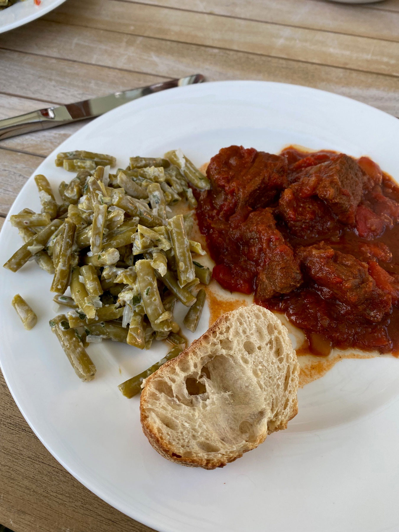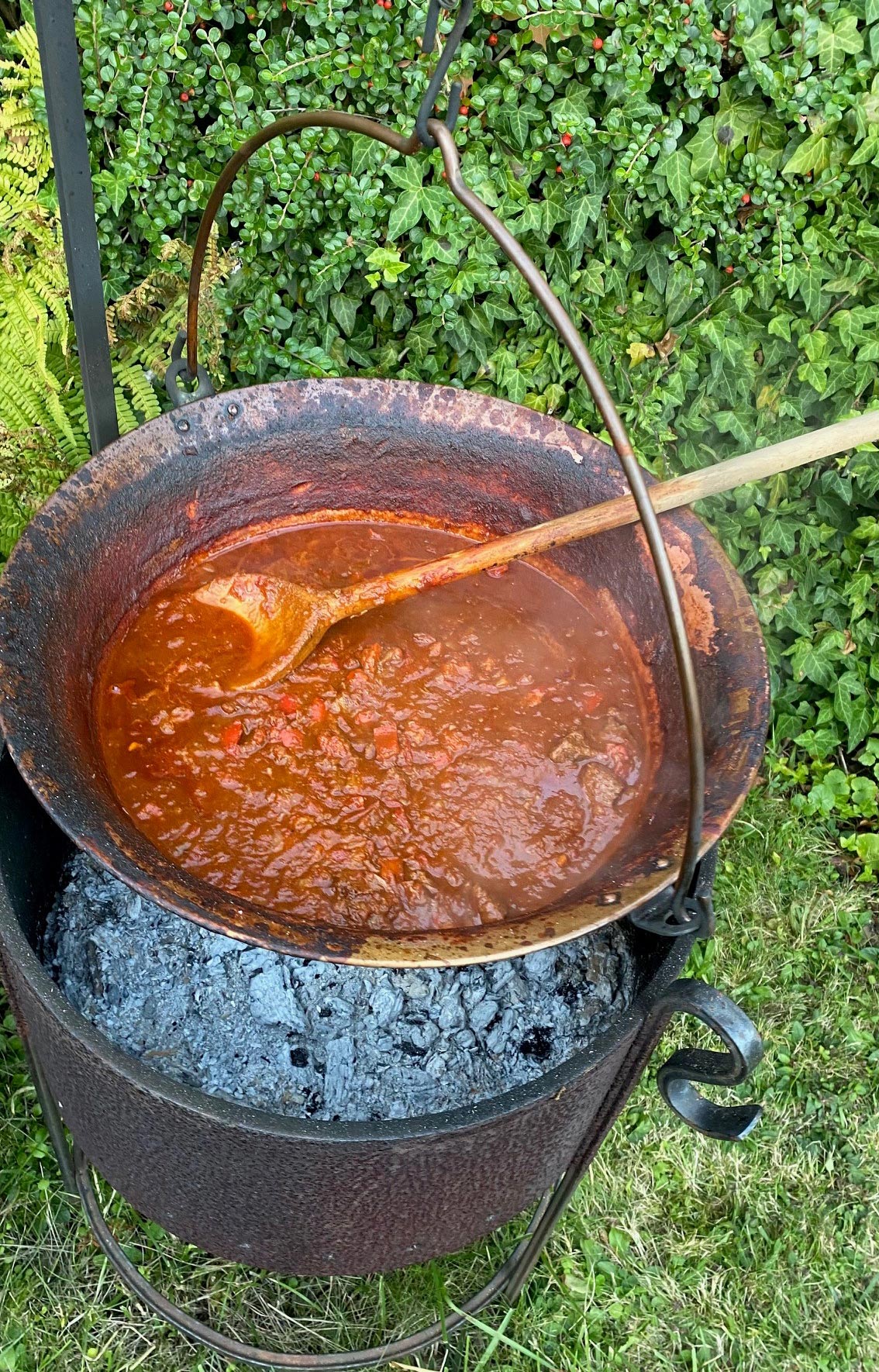 Immer wieder Lecker, besonders wenn es draussen gekocht wird. Zu dem Gulasch gab es Brot und Bohnensalat.