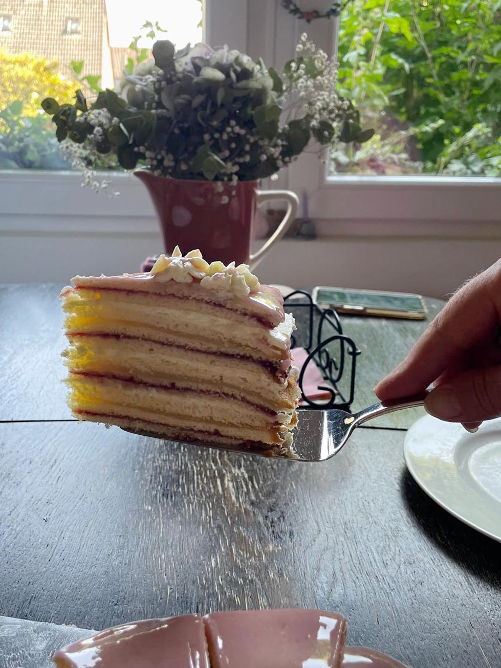 The best cake I know of is "Prinzregententorte", and of course it tastes best from my grandma. The cake was first mentioned in the 19th century in Bavaria, and it is originally made of multiple layers of sponge mixture with again several layers of chocolate buttercream and chocolate. My grandma used to put different stuffing instead, buttercream, marzipan and sour cherry jam and a sugar icing. Just yummy! I never had the original chocolate recipe tho and there is no need to change it. 😉