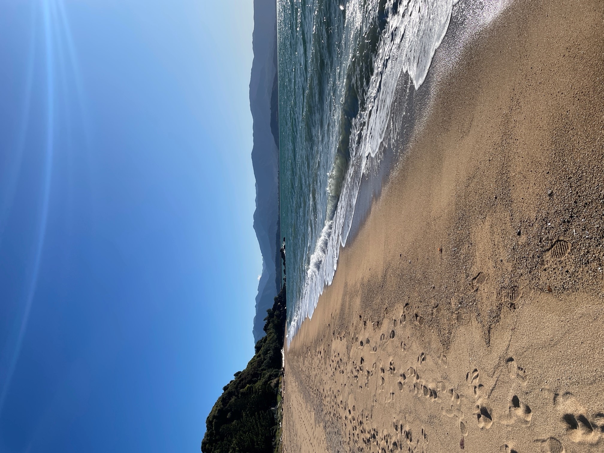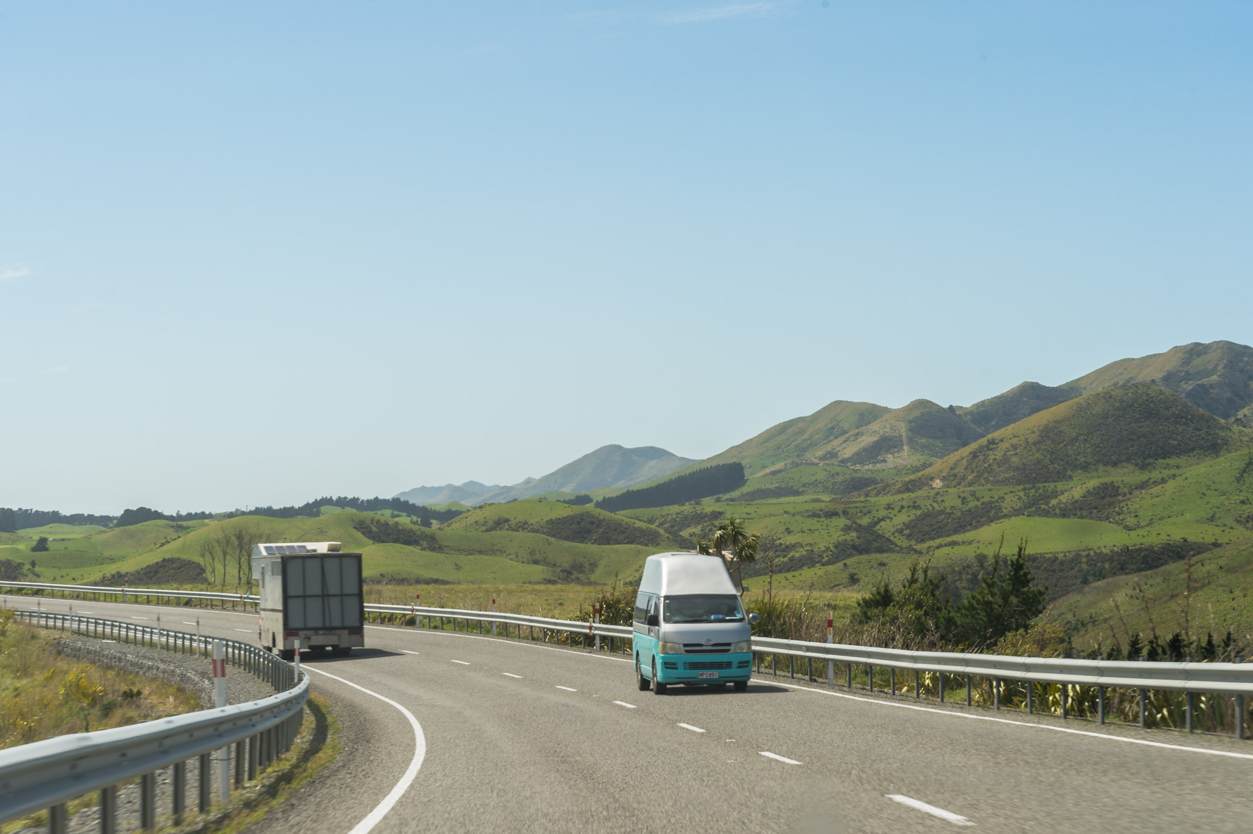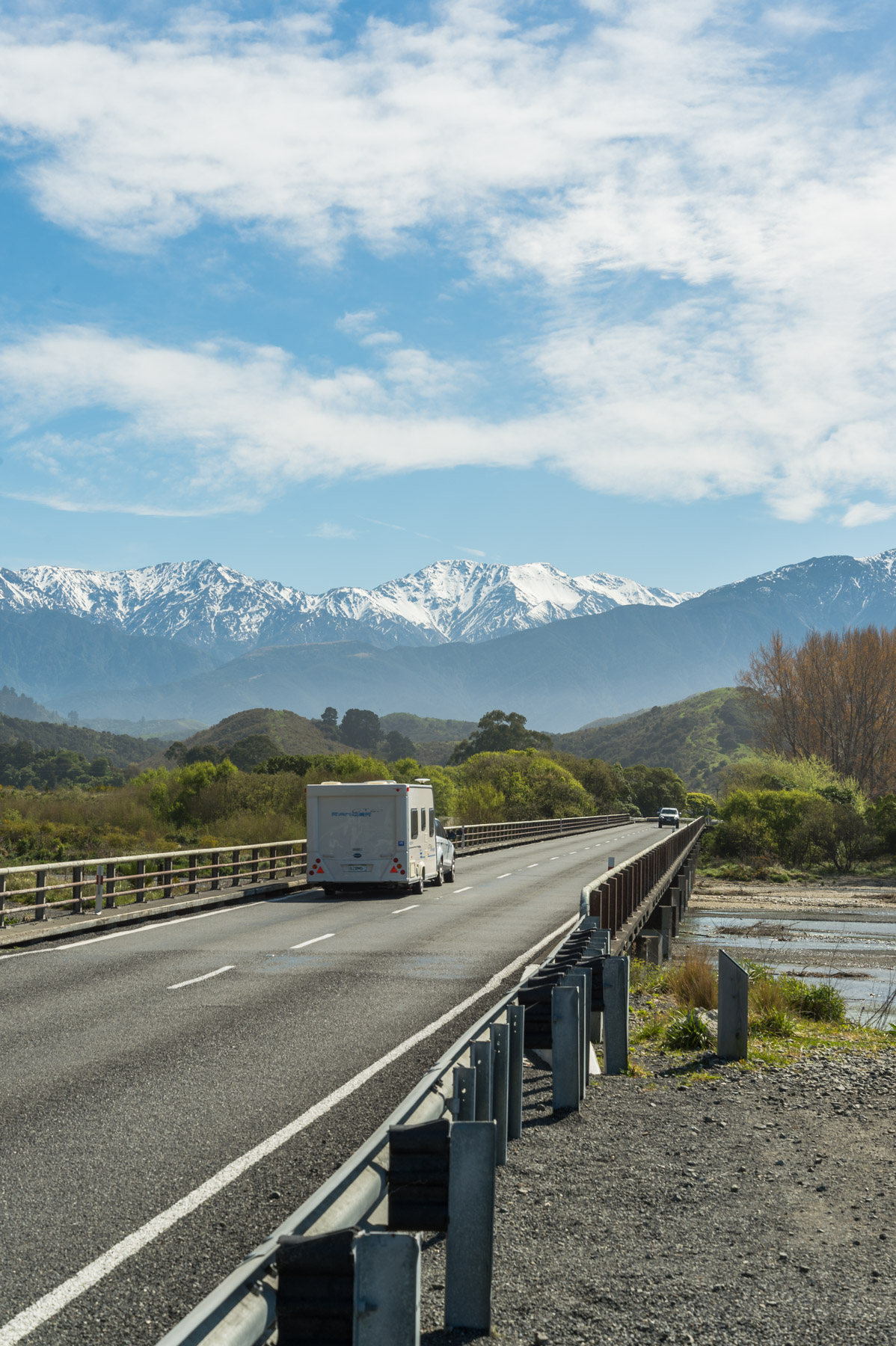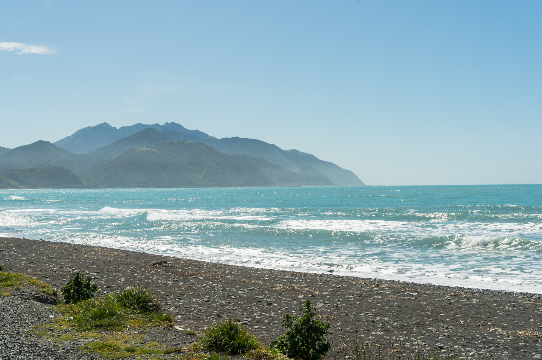 The journey yesterday from Cheviot here to Takaka went along the east coast with the mountains on the left and the ocean on the right, via the vacation place Kaikōura, the cities Blenheim and Nelson.