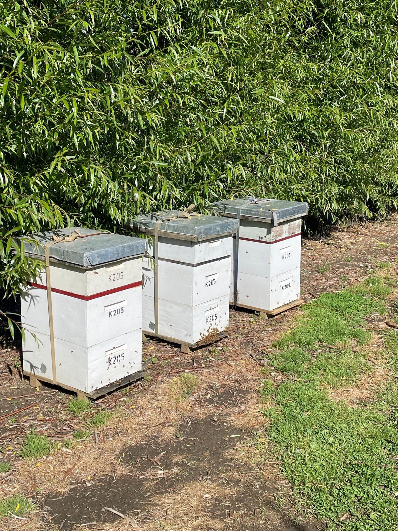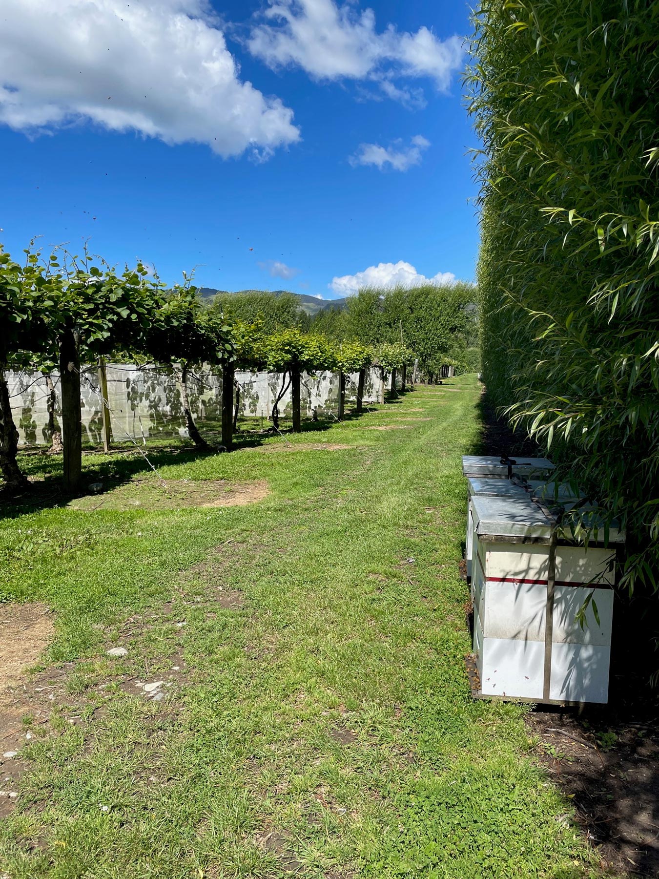 Seit heute bzw. nach dem es die letzten beiden Tage geregnet hat und wir wieder arbeiten waren, standen Bienenstöcke verteilt auf der Plantage. Somit hatten wir zwischen den Kiwibäumen ab und an ein Summen im Ohr.