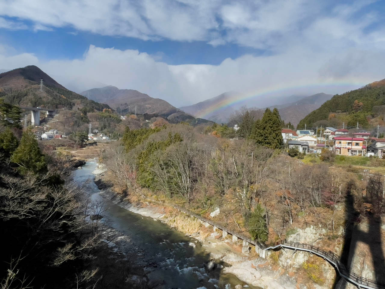 Auf der einen Seite haengen die Regenwolken in den Bergen und auf der anderen Seite kommt die Sonne und schwupps haben wir einen Regenbogen ueber dem Doerfchen.